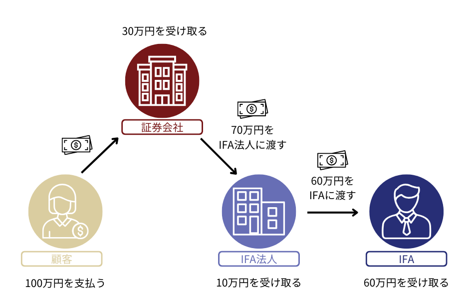 例えば、顧客が支払った100の手数料のうち、証券会社が受け取るのは約30であり、残りの約70がIFA法人に渡る。